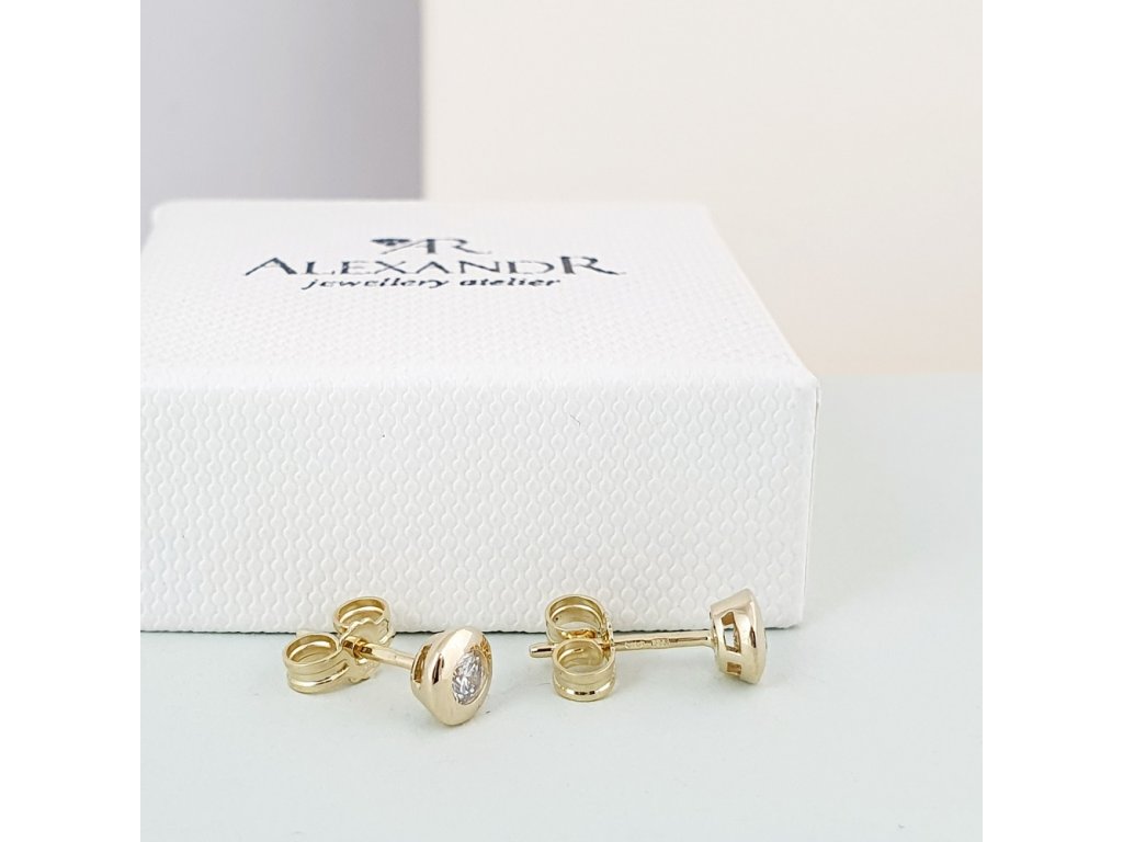 Dámské náušnice pecky s diamanty, žluté zlato, vsazení kamenu typu Bezel. Náušnice se zapínají na puzetu.