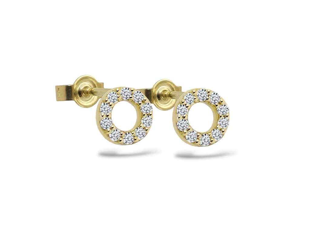 Jemné náušnice ze žlutého zlata, náušnice zdobí celkem 20 zářivých diamantů o průměru 1.3mm ve tvaru kroužku. Náušnice jsou ručně vyrobené v našem ateliéru.