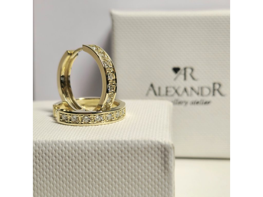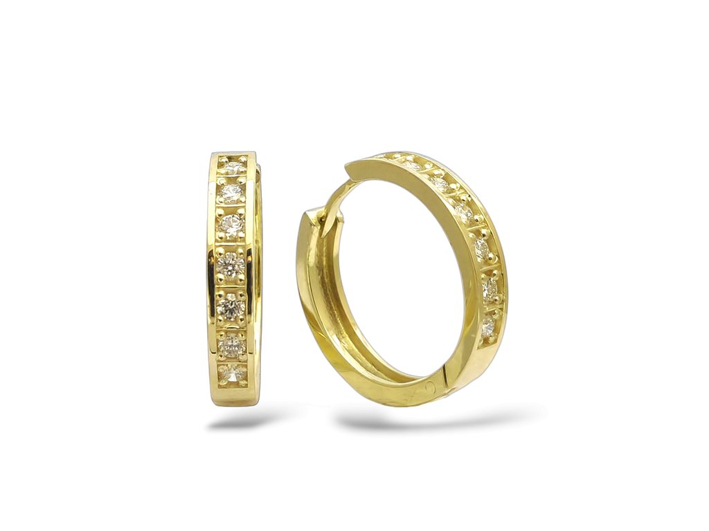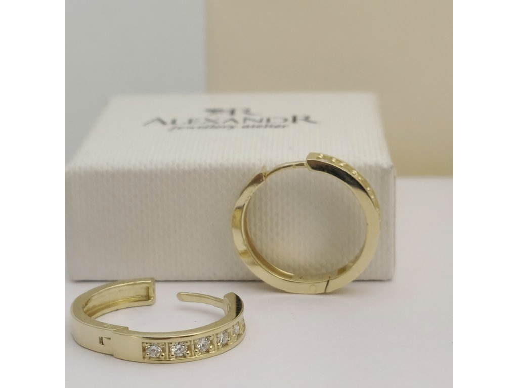 Dámské náušnice Kruhy, žluté zlato, zářivé diamanty vsazené do řady. Náušnice se zapínají na kloubový zámek.