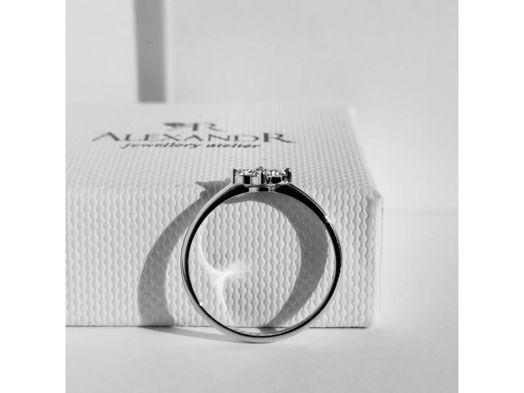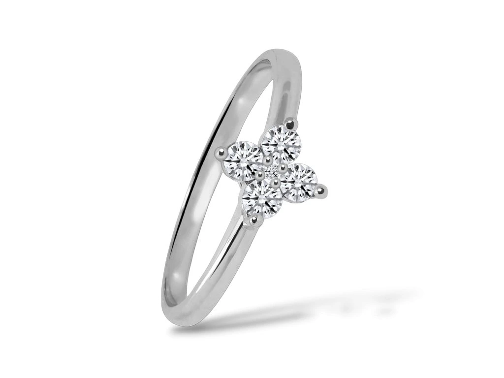 Prsten z bílého zlata a diamanty, centrální diamant o průměru 1.0 mm obklopují 4 diamanty o velikosti 2.3 mm a tvoří tvar čtyřlístku.