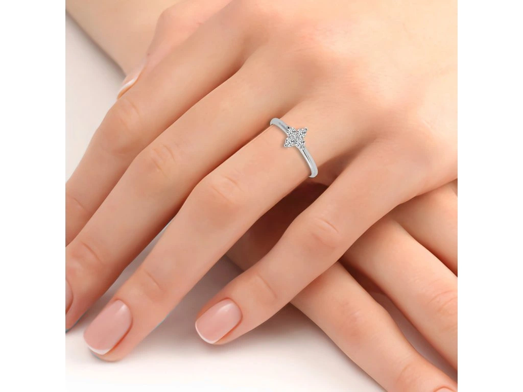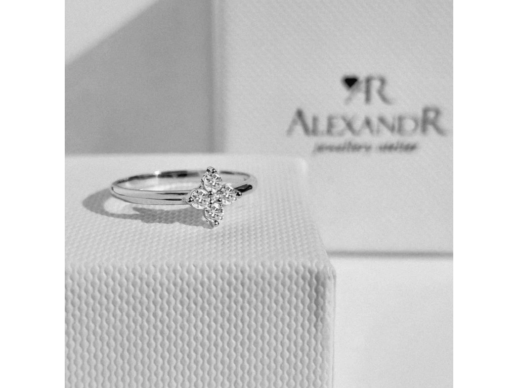 Jemný prsten s diamanty, bílé zlato, diamanty v briliantovém brusu tvoří tvar čtyřlístku. Prsten je vhodný jako zásnubní prsten.