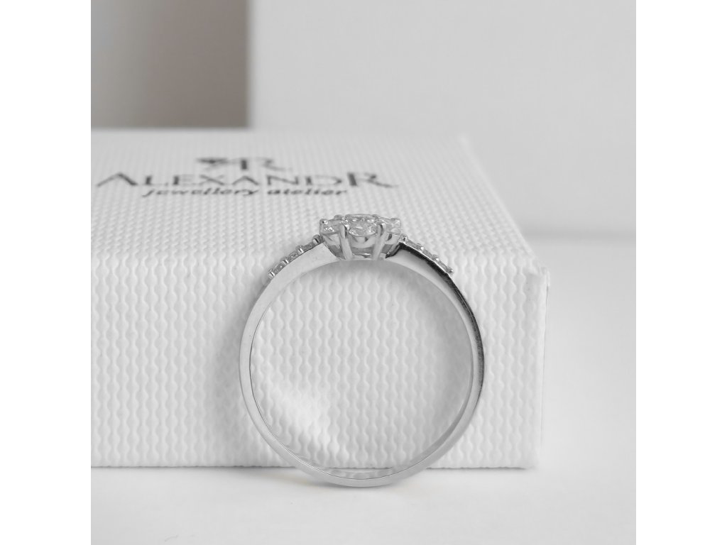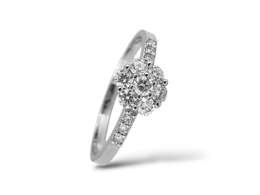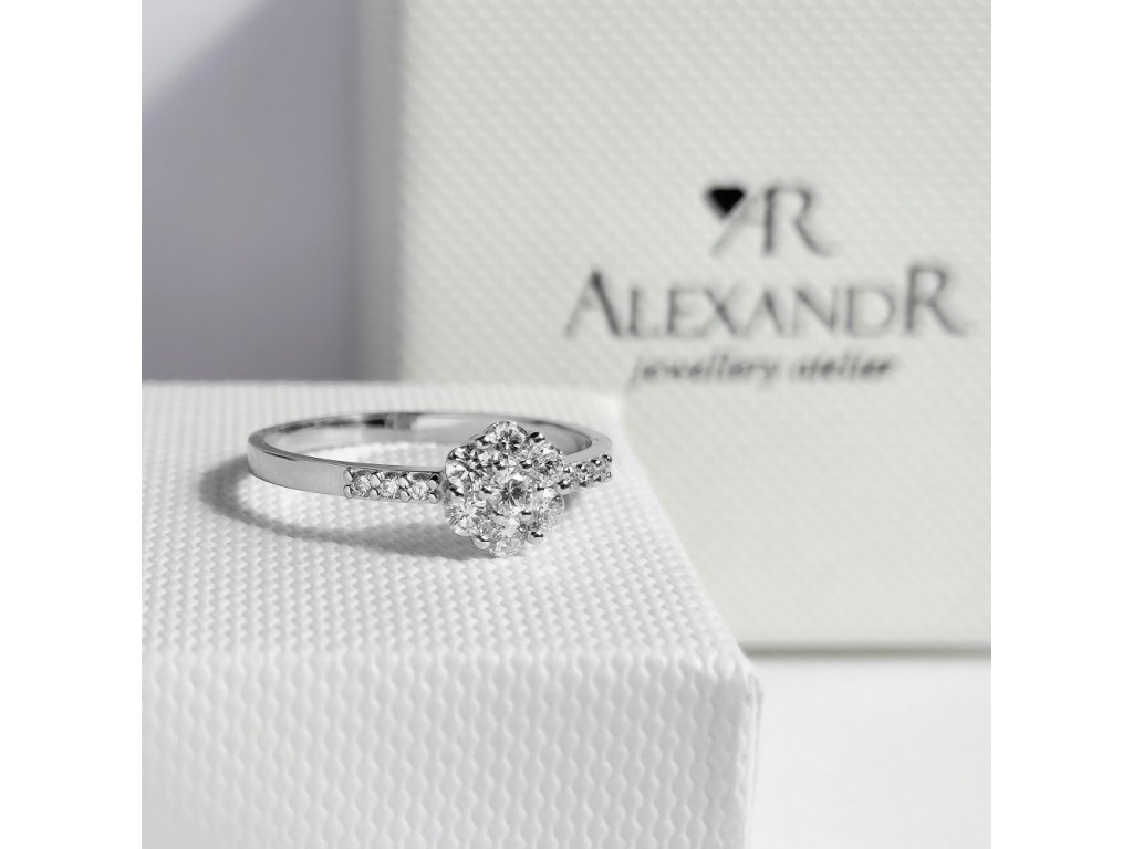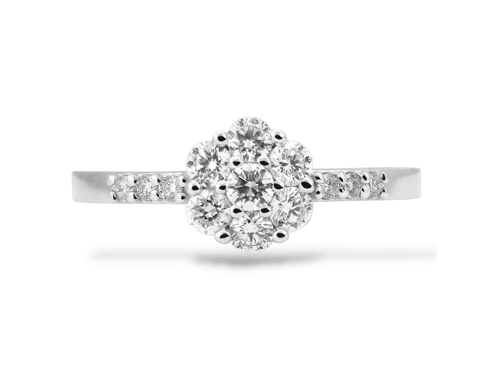 Elegantní prstýnek z bílého zlata, korunku prstenu zdobí 7 přírodních diamantů o průměru 2.3mm, které tvoří tvar kytičky a po stranách je doplněn 6 diamanty o průměru 1.3mm.