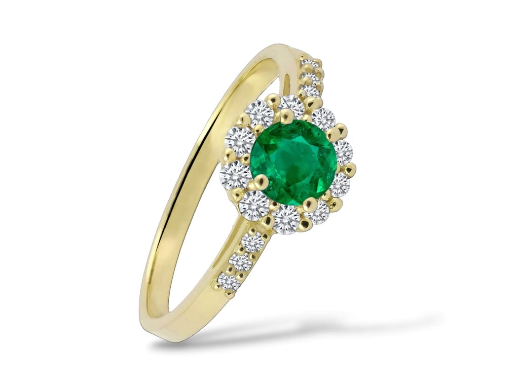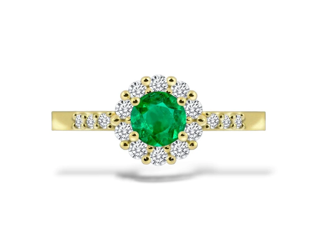 Elegantní prsten ze žlutého zlata, centrální přírodní smaragd o průměru 4.5mm je obklopen 10 diamanty o průměru 1.7mm, které jsou usazeny v krapnách. Obroučku prstenu zdobí 6 diamantů o průměru 1.3mm.
