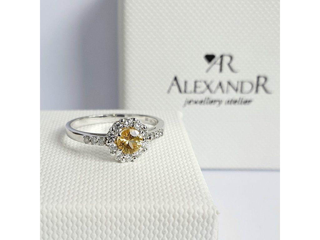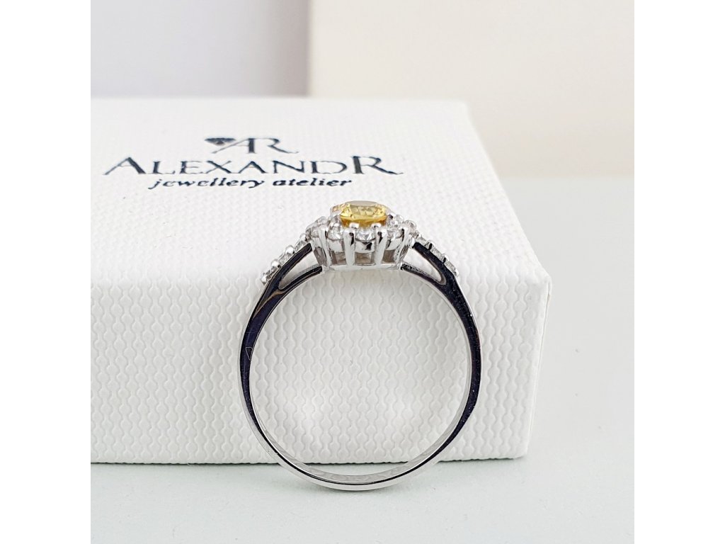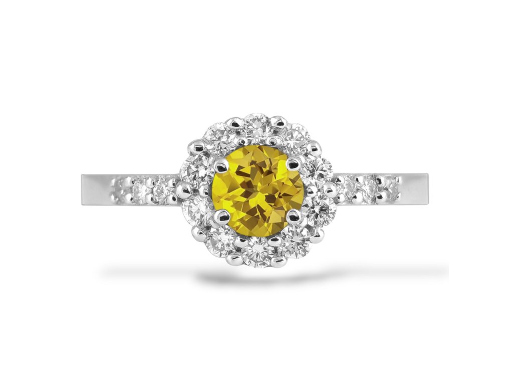 Prsten se žlutým safírem a diamanty, bílé zlato, centrální přírodní žlutý safír je obklopen zářivými diamanty v briliantovém brusu.