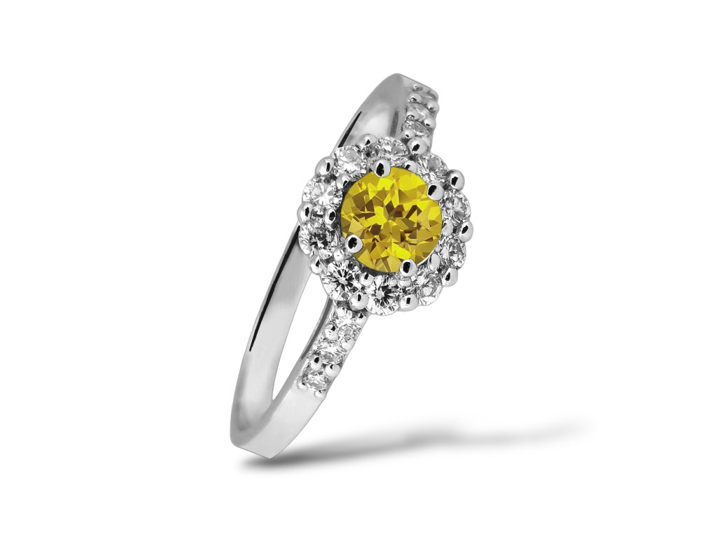 Elegantní prsten z bílého zlata, centrální přírodní žlutý safír o průměru 4.5mm je obklopen 10 diamanty o průměru 1.7mm, které jsou usazeny v krapnách. Obroučku prstenu zdobí 6 diamantů o průměru 1.3mm.
