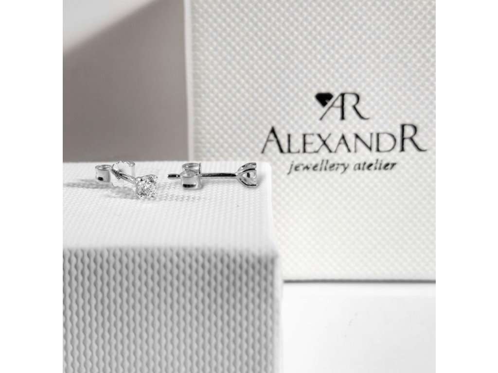Jemné náušničky z bílého zlata zdobí zářivý diamant v briliantovém brusu o průměru 3.4mm zasazeným do čtyř krapen. Náušnice se zapínají na puzetu a jsou vhodné i pro mladé slečny.