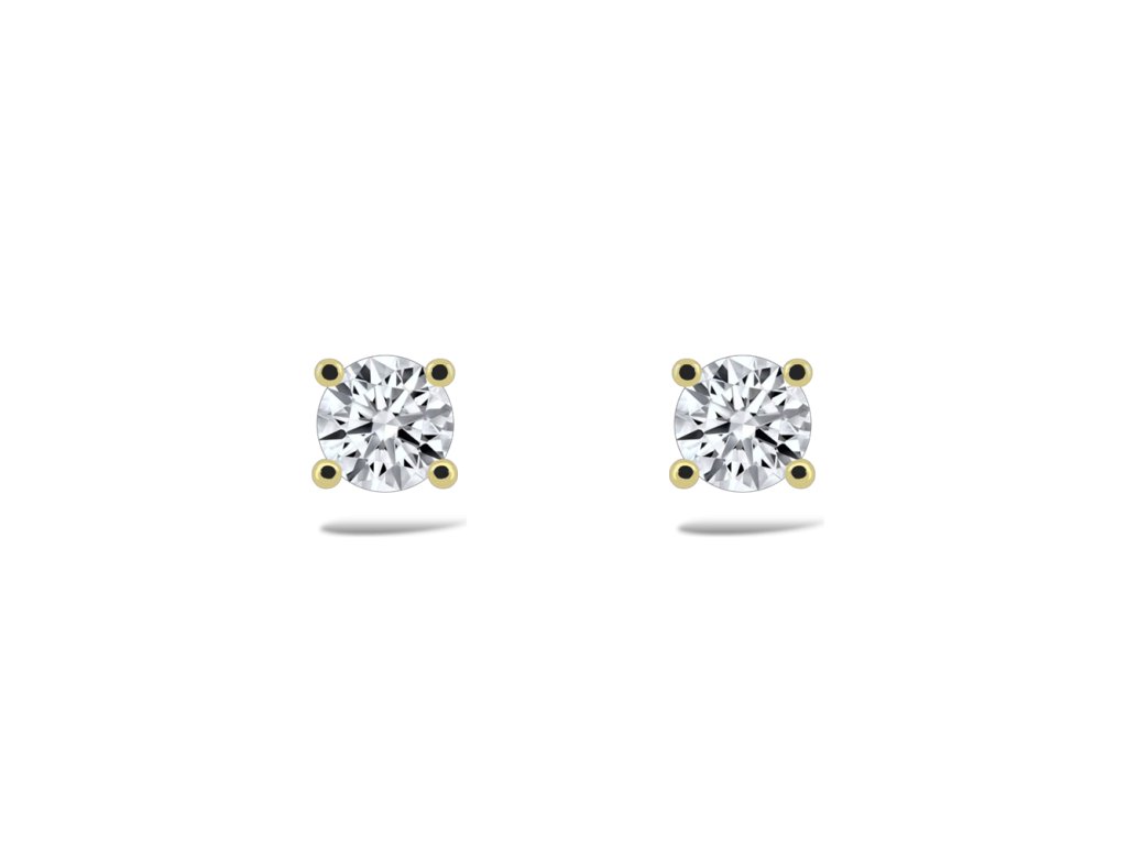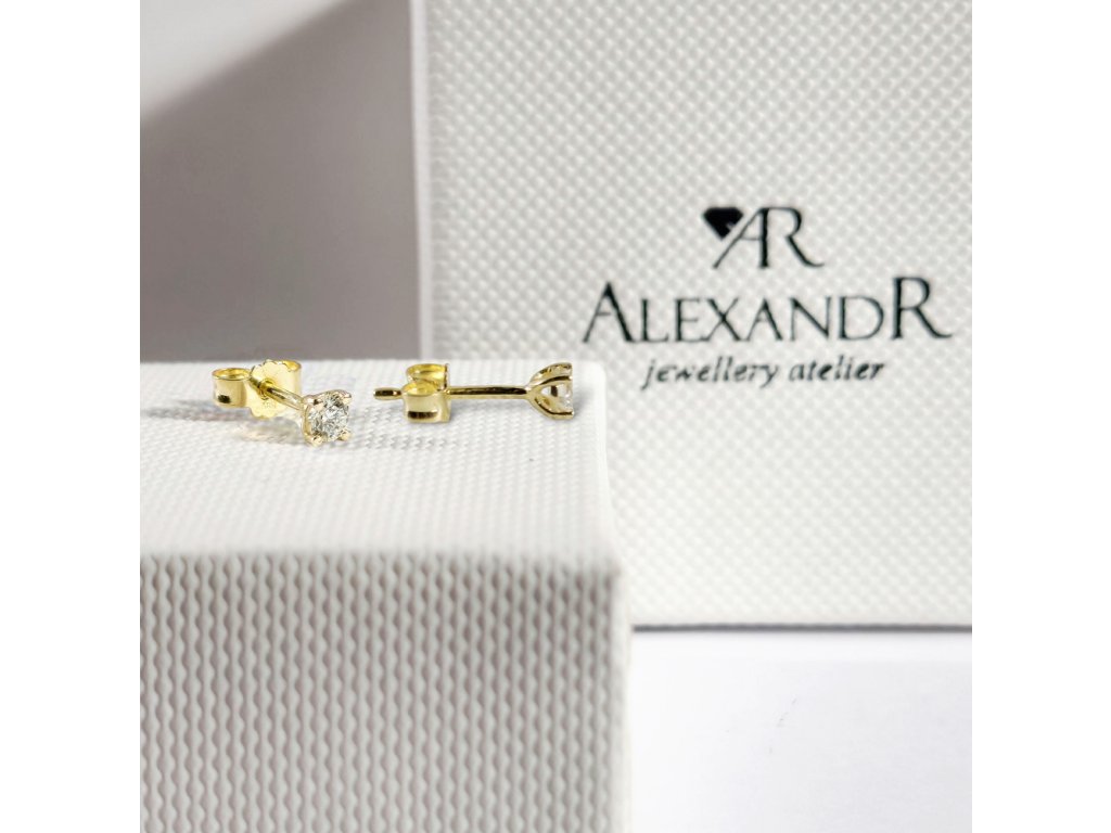 Jemné náušničky ze žlutého zlata zdobí zářivý diamant v briliantovém brusu o průměru 3.4mm zasazeným do čtyř krapen. Náušnice se zapínají na puzetu a jsou vhodné i pro mladé slečny.