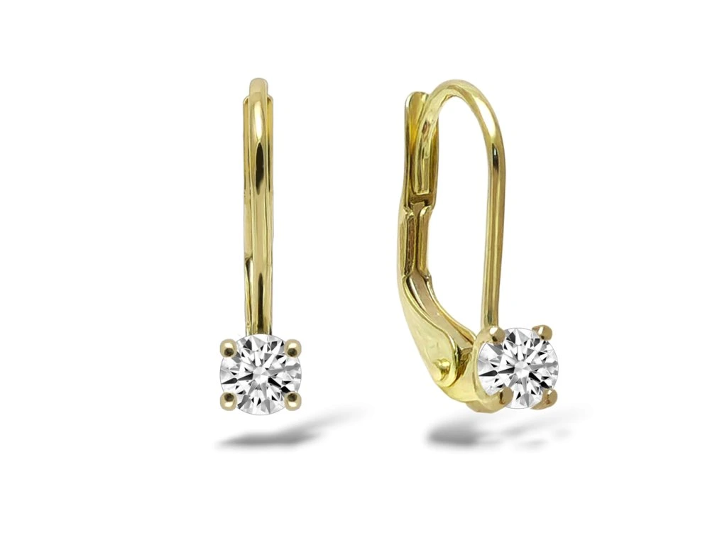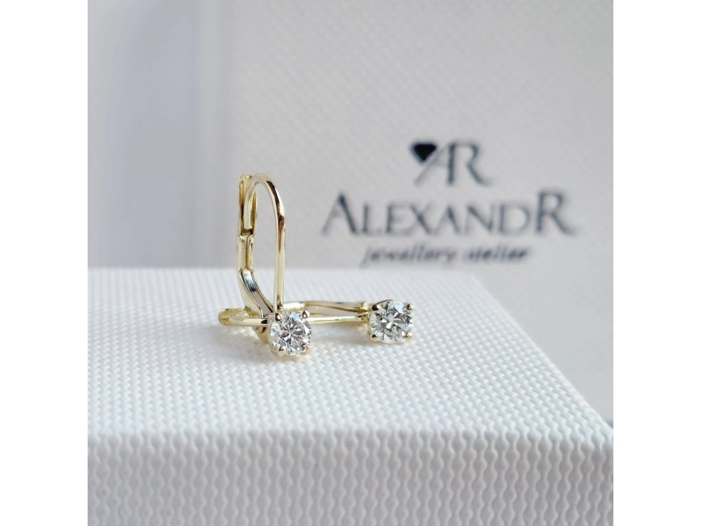 Jemné diamantové náušnice, žluté zlato, náušnice zdobí diamanty v briliantovém brusu o velikosti 3.4 mm a zapínají se na patent.