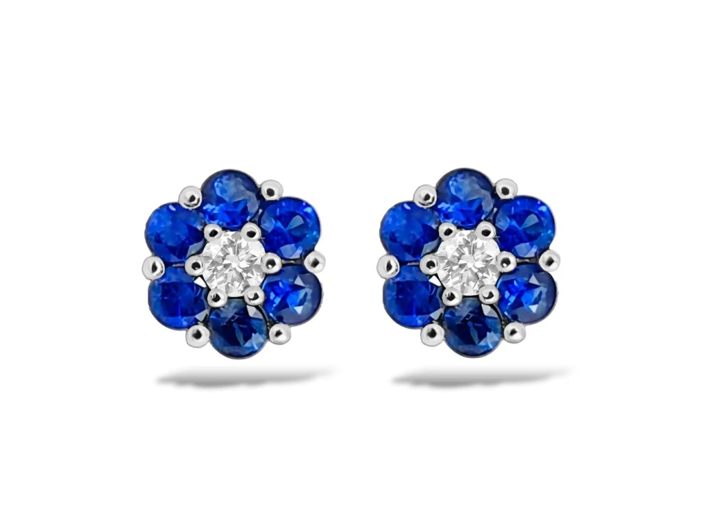 Náušnice z bílého zlata, centrální zářivý diamant o průměru 2.3mm je obklopen 6 přírodními safíry stejného průměru a tvoří tvar kytičky. Náušnice jsou ručně vyrobené v našem ateliéru.