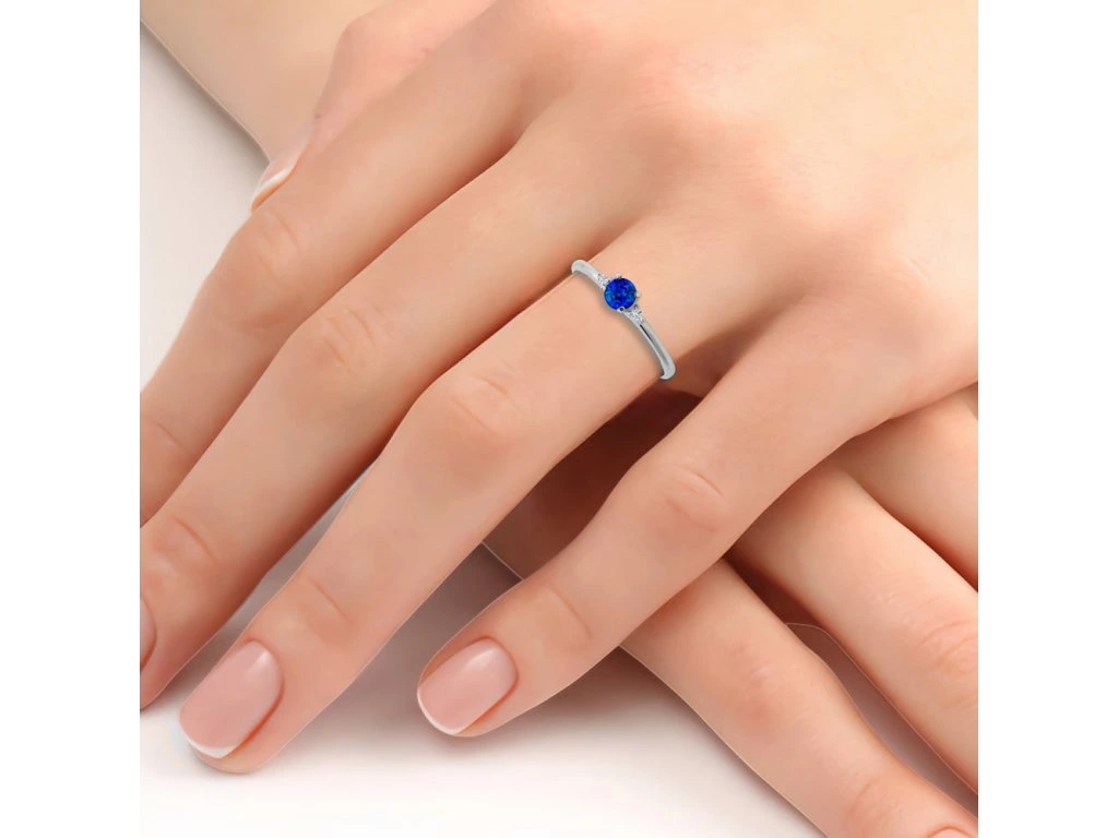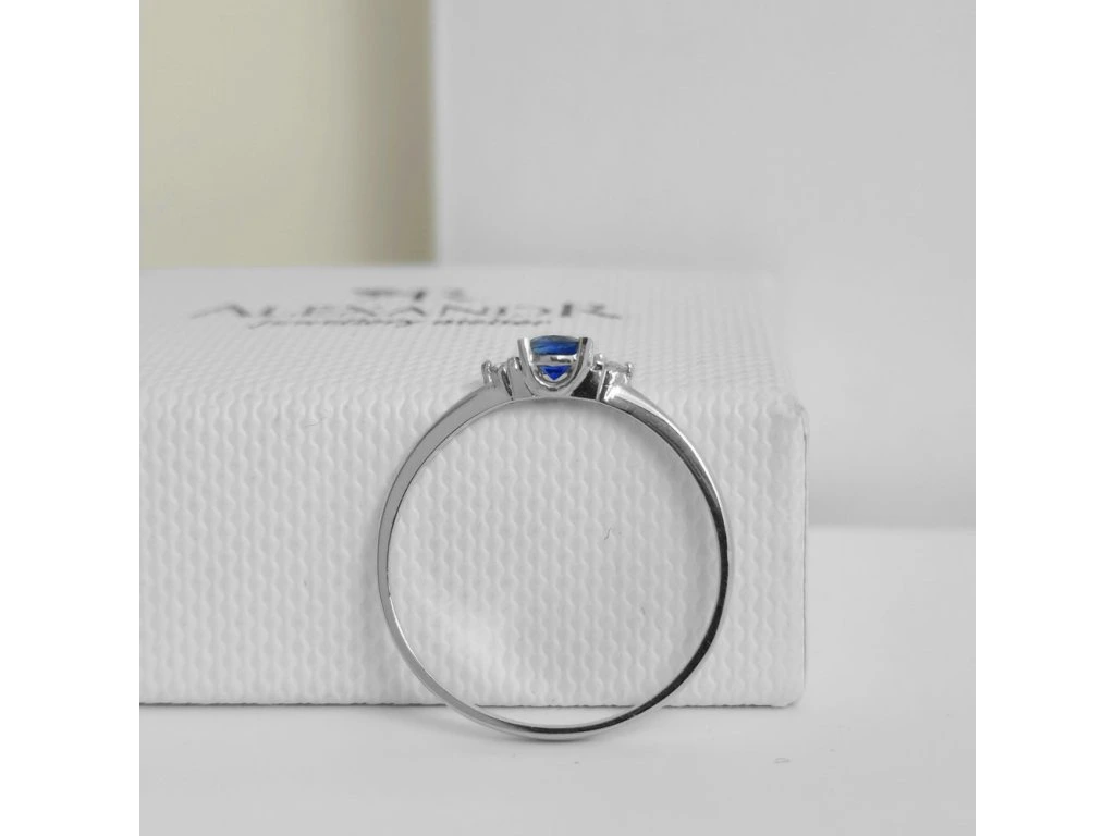 Prsten z bílého zlata se třemi kameny, centrální přírodní safír o velikosti 3.5 mm po stranách zdobí 2 zářivé diamanty o průměru 1.3 mm.