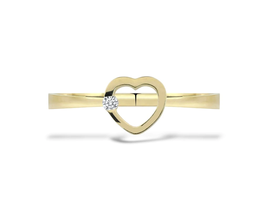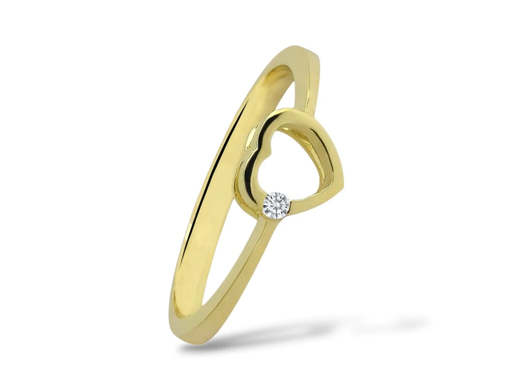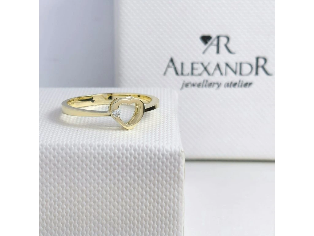 Jemný prstýnek ze žlutého zlata ve tvaru srdíčka zdobí 1 zářivý diamant o průměru 1.7mm.