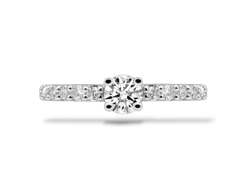 Prsten z bílého zlata, centrální zářivý diamant o průměru 3.7mm je po stranách doplněn 10 diamanty v briliantového brusu o průměru 1.5mm.