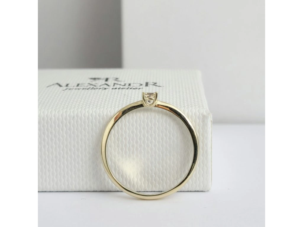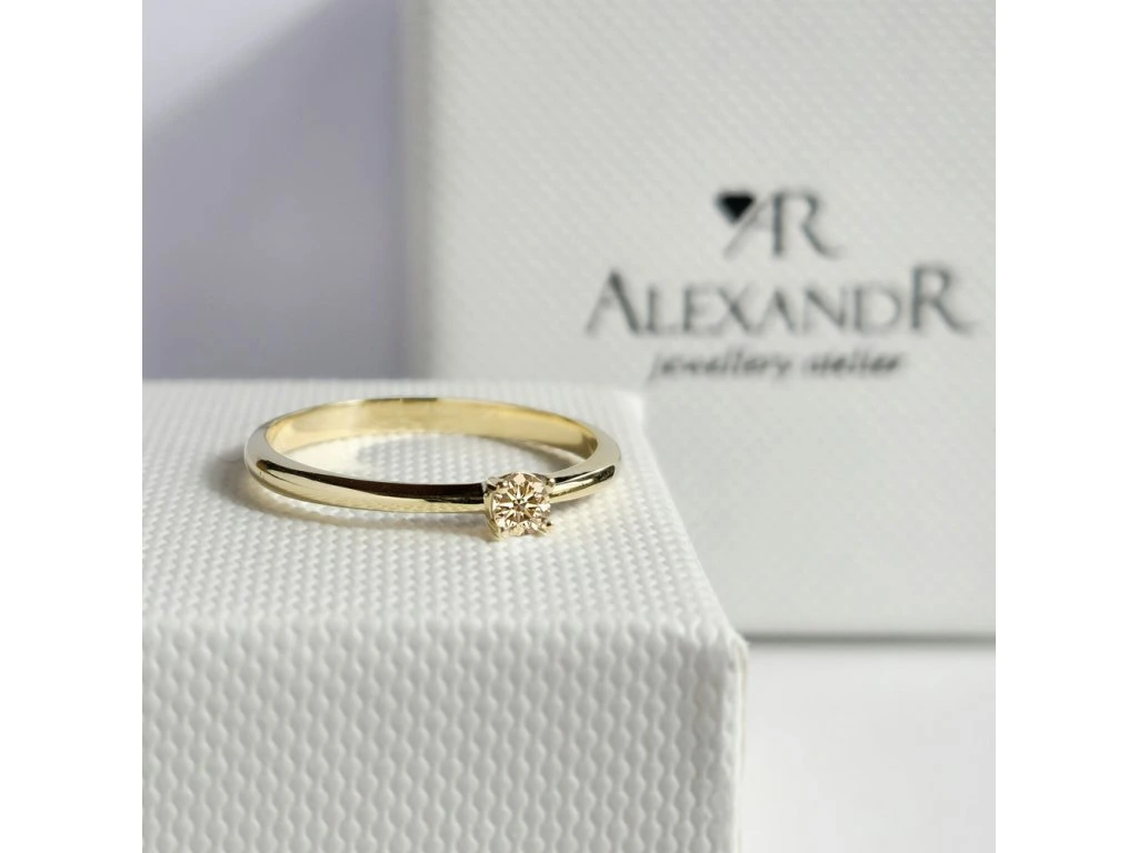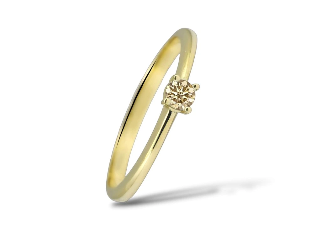 Jemný zásnubní prstýnek ze žlutého zlata s diamantem v barvě champagne.