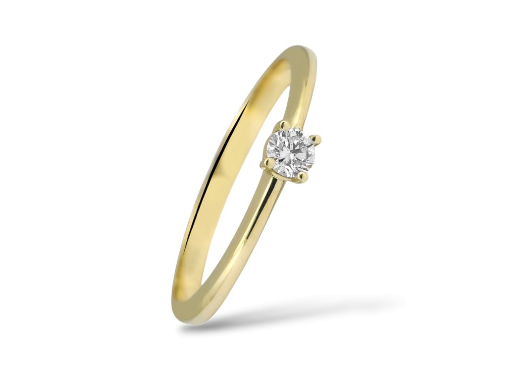 Jemný zásnubní prstýnek ze žlutého zlata zdobí zářivý diamant v briliantovém brusu o průměru 3.0mm zasazeným do čtyř krapen.