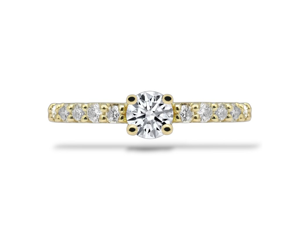 Prsten ze žlutého zlata, centrální zářivý diamant o průměru 3.7mm je po stranách doplněn 10 diamanty v briliantového brusu o průměru 1.5mm.