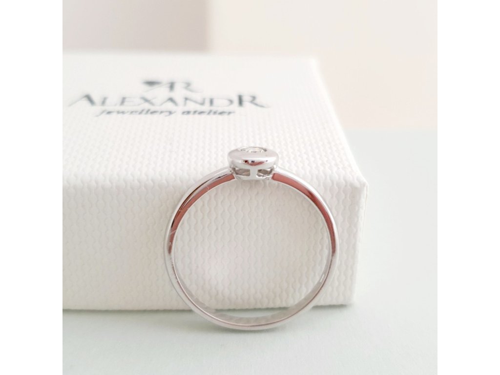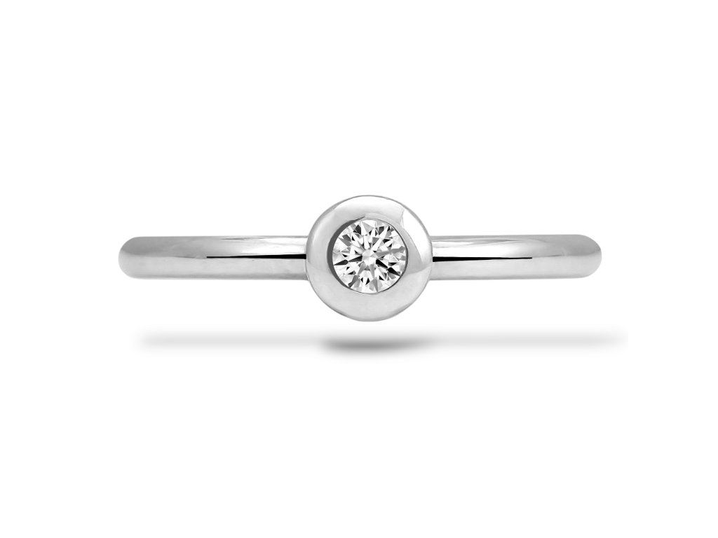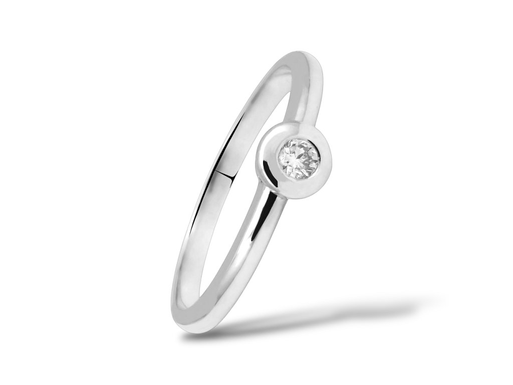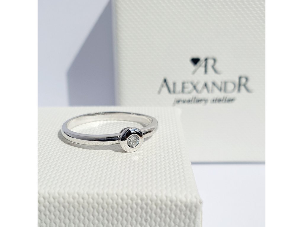 Prsten z bílého zlata, 1 zářivý diamant v briliantovém brusu o průměru 2,5mm vsazen do obruby typu bezel.