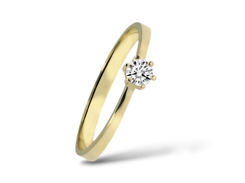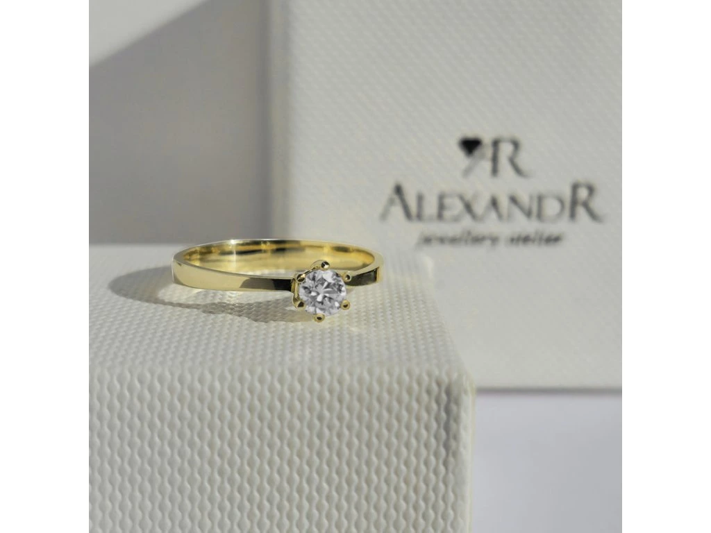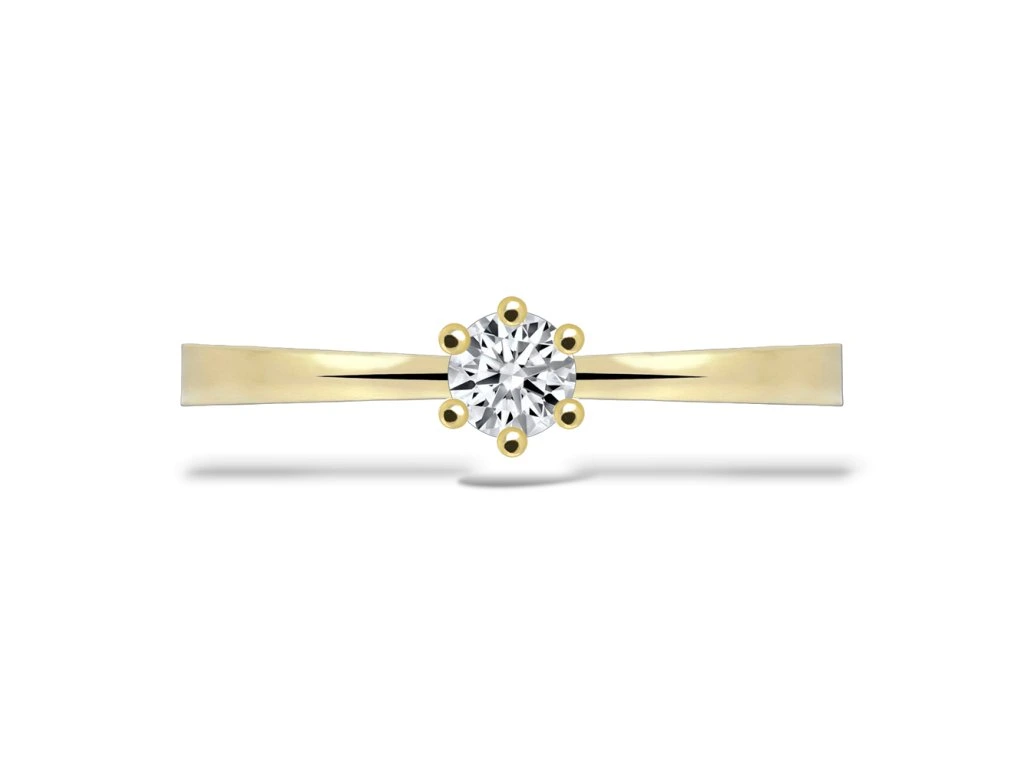 Zásnubní prsten s diamantem, žluté zlato. Tradiční vsazení kamene do šesti krapen.