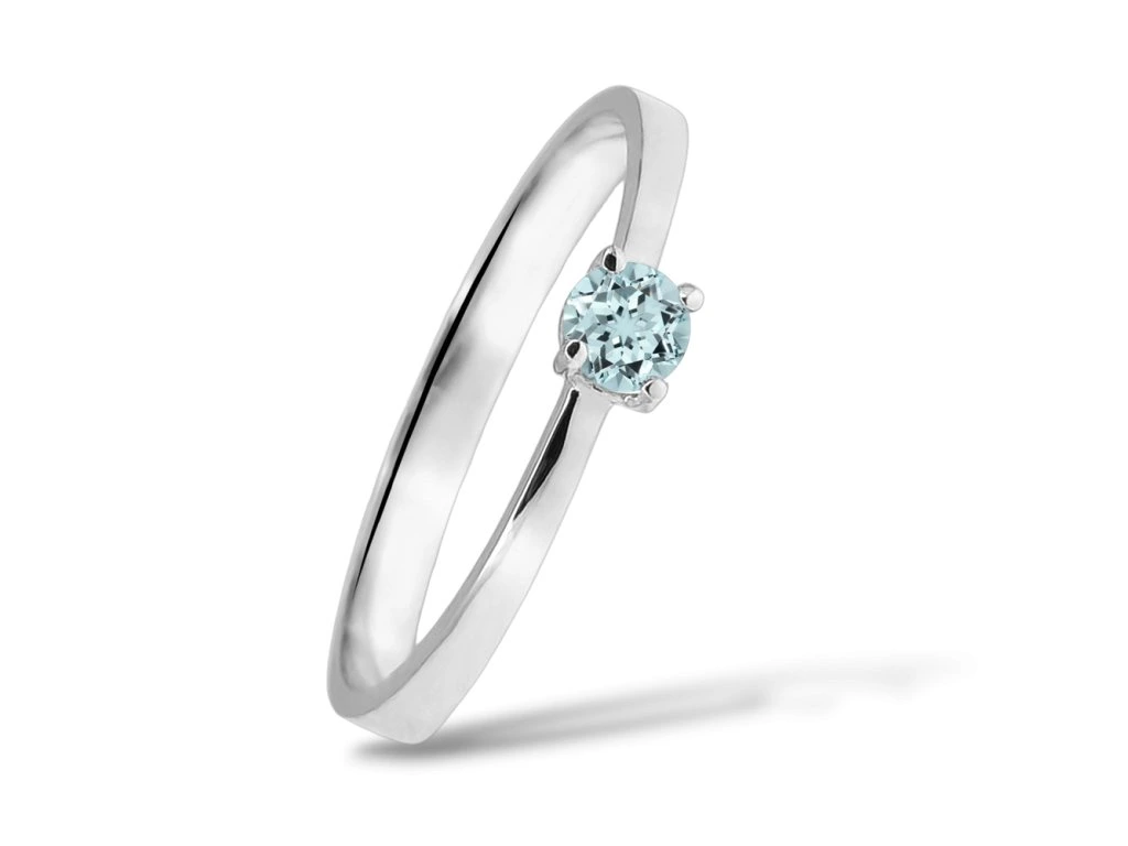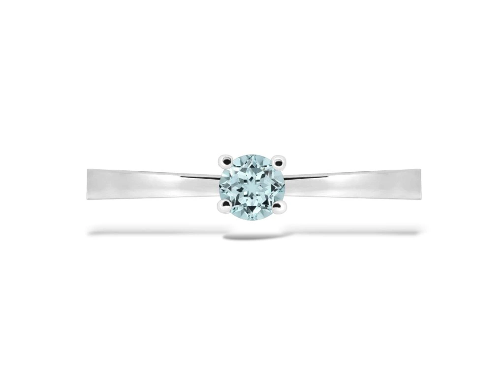 Jemný zásnubní prstýnek z bílého zlata zdobí přírodní akvamarín o průměru 3.5mm zasazený do čtyř krapen.