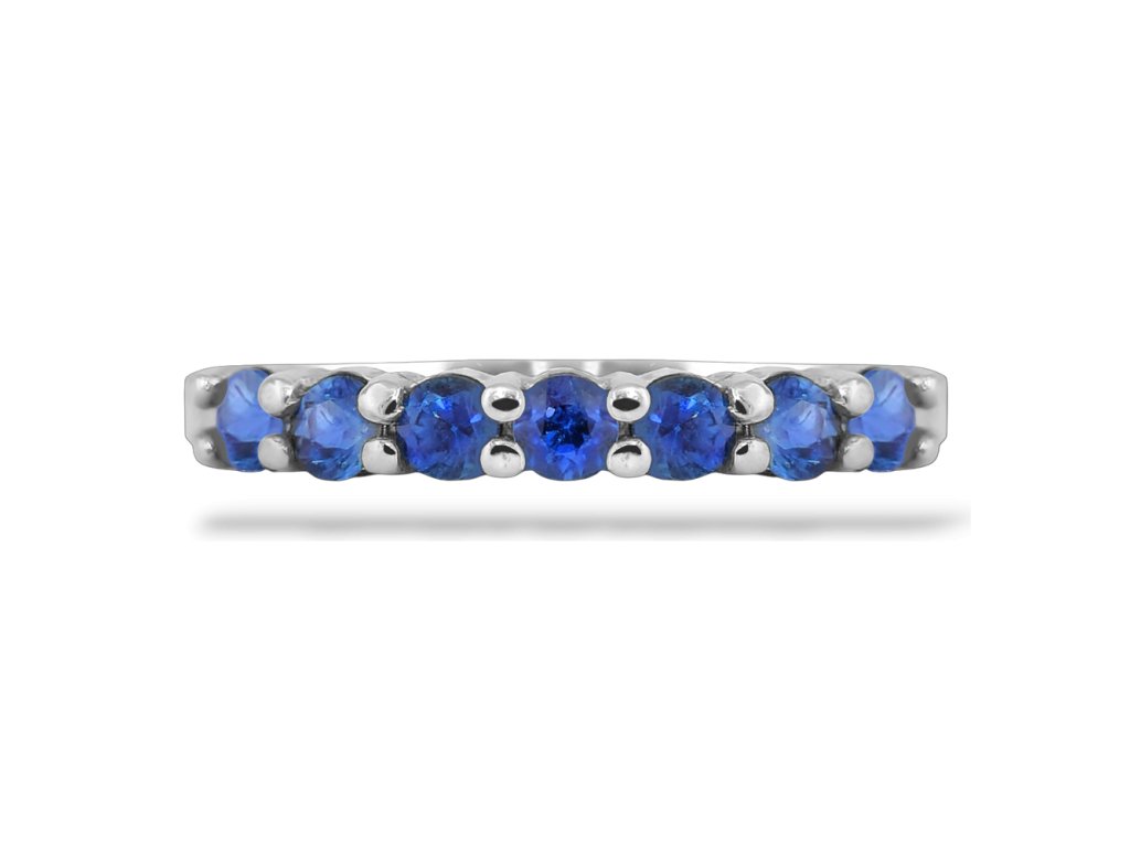 Prsten z bílého zlata s kameny vsazené do řady, 7 přírodních modrých safírů o průměru 2,5mm.